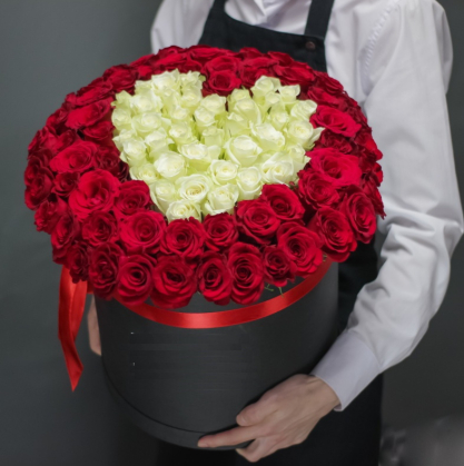 Сердце из 51 розы в шляпной коробке