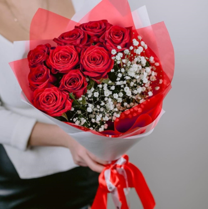 Букет из красных роз и гипсофилы