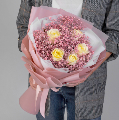 Букет "Нежные объятия" с крашенной гипсофилой и розой в Клине
