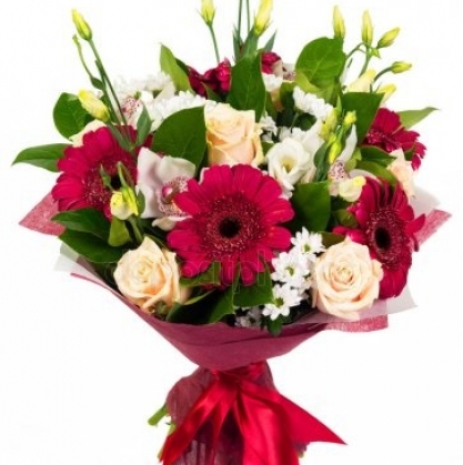 Восхитительный букет из розы, герберы ,кустовой хризантемы ,эустомы ,орхидеи и салала в стильной упаковке