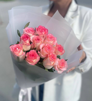 Классический букет из красных роз, по середине белые с добавлением рускуса (зелени) и в упаковке. Букет представлен в трех вариантах: классический (11 роз), стандарт (15 шт.) и VIP (19 шт.).
